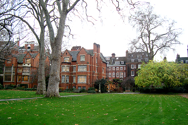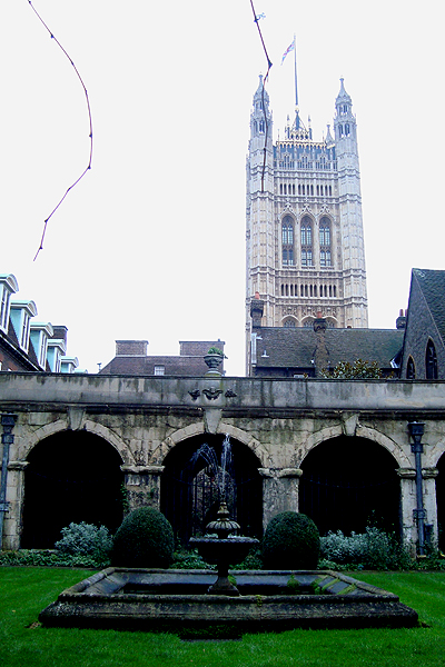 A fountain in another courtyard, with a nice view of Victoria Tower.